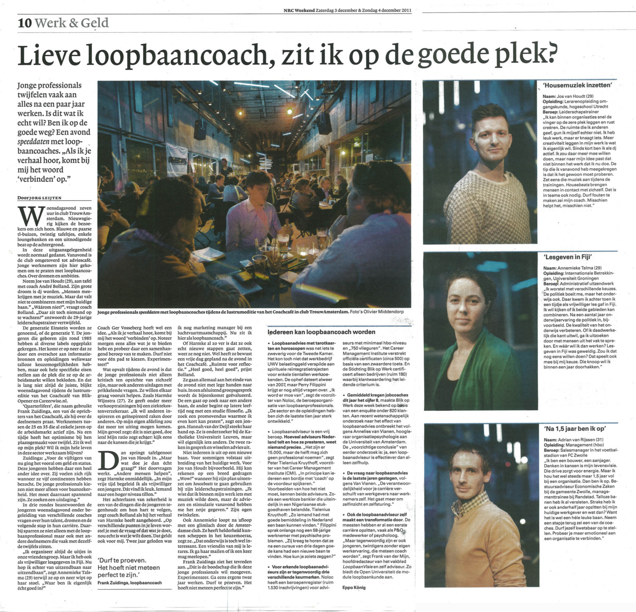 NRC Schreef een paginagroot artikel over ons Lustrum Coachcafé in Trouw op 30 november 2011, inclusief drie portretten van deelnemers. Het artikel geeft een goede sfeerimpressie. Lees het hier.